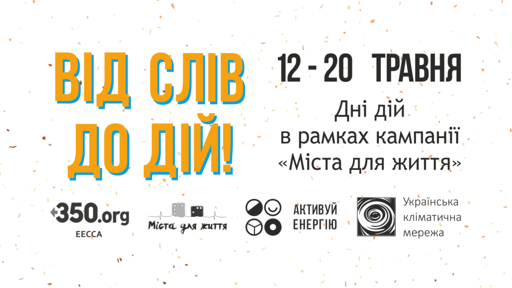 Члени Української кліматичної мережі приєдналися до масштабної кампанії “Міста для життя”, що ініційована партнерами – міжнародною організацією 350.org. З 12 по 20 травня понад 14 міст України проведуть різноманітні масові заходи для привернення уваги влади та місцевих жителів до теми зміни клімату.Другий рік поспіль міжнародна громадська організація 350.org – яка об’єднує сотні тисяч активістів, які працюють разом задля вирішення одного із найбільших викликів людства – зміни клімату, проводить кліматичні акції до Дня Дій.